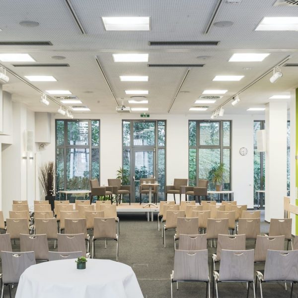Die Kombination aus unseren Seminarräumen Dom und Rathaus fasst bis zu 100 Personen. Damit eignet sich dieser barrierefreie Tagungsraum optimal für Tagungen und Kongresse. Dieser Raum ist modern gestaltet und wirkt durch seine hohen Decken besonders großzügig.